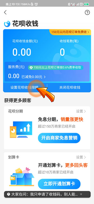 避免花呗的手续费需要将收款额度调整为150元以内,首先打开支付宝APP,点击右下角“我的”图标,然后点击“商家服务”,之后点击“更多”图标,找到并点击“花呗收钱”选项,再点击“设置花呗收钱额度”,将金额设置为150元即可。