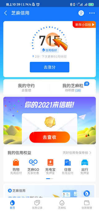 3、进入芝麻信用页面后,页面上方的数字即为芝麻信用分。