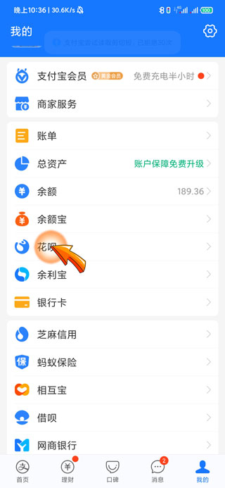 2、进入我的页面后,找到并点击进入“花呗”选项。