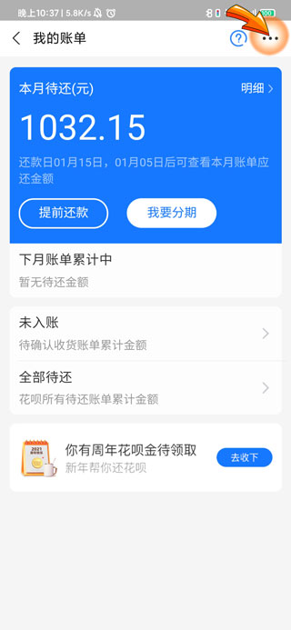 花呗查看全年账单需要打开支付宝APP,点击首页右下角的“我的”图标,然后点击“花呗”选项,之后点击花呗页面中的“我的账单”选项,再点击页面右上角的“三点”符号,最后点击“历史账单”选项即可。