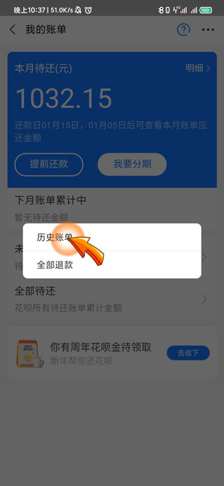 5、最后点击弹出窗口中的“历史账单”选项即可。