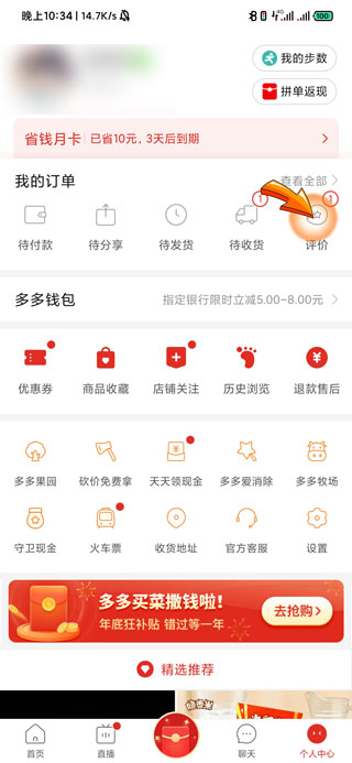 1、拼多多进行评论首先需要打开拼多多APP,点击首页右下方的“个人中心”图标。