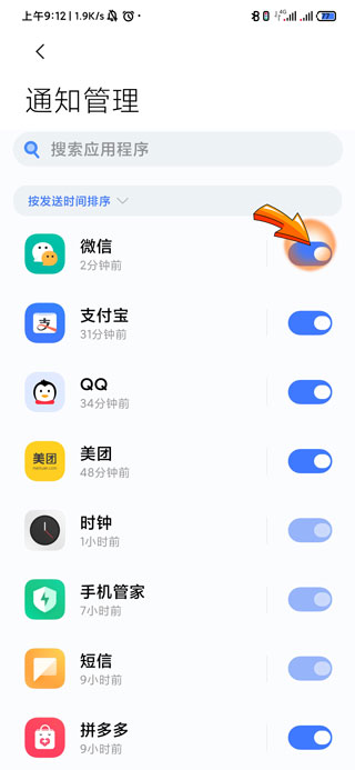4、在通知管理页面中找到“微信”图标,点击关闭右侧的开关按钮即可。