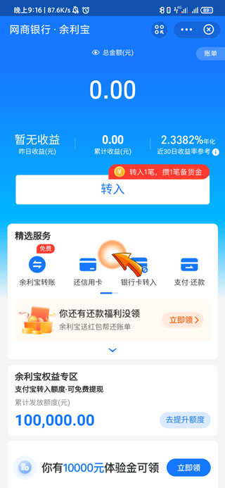 3、进入余利宝页面后,向左滑动“精选服务”页面。