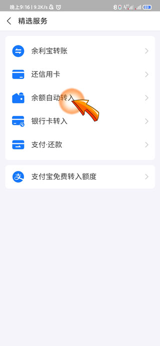 5、选择需要关闭的自动转入项目,例如点击“余额自动转入”选项。