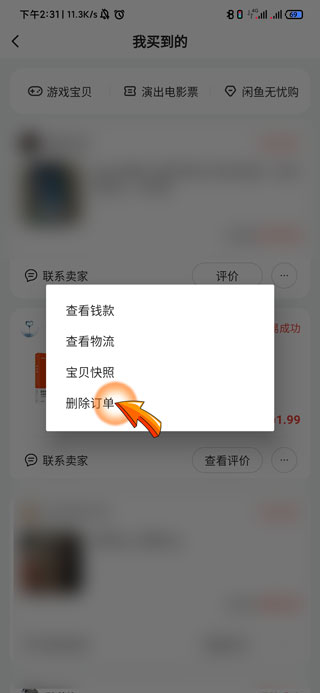 不让人看闲鱼购买记录需要打开闲鱼APP,点击页面右下角的“我的”图标,然后点击我的页面中的“我买到的”图标,找到并点击购买订单右下角的“三点”符号,最后点击弹出页面中的“删除订单”选项即可。