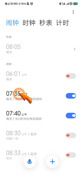 2、进入闹钟页面后,点击需要设置的“时间”。
