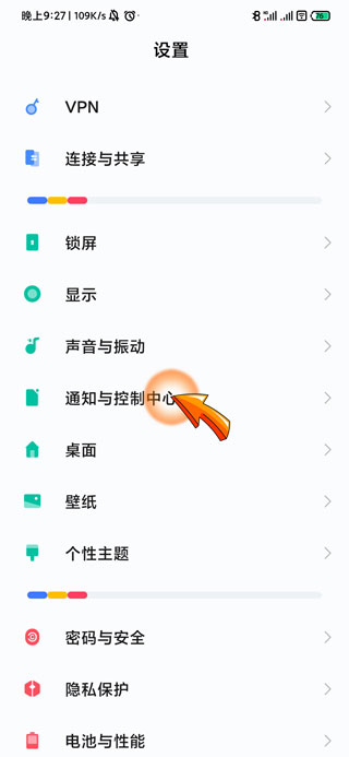 2、然后点击设置页面中的“通知与控制中心”选项。