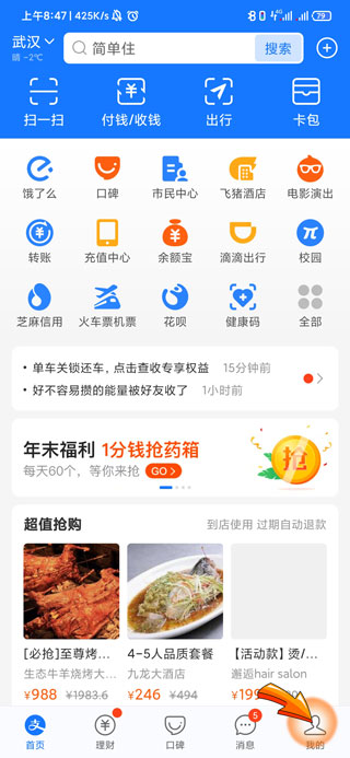 1、花呗设置24个月分期需要打开支付宝APP,点击页面右下角的“我的”图标。