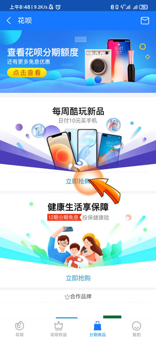 3、进入花呗页面后,点击下方的“分期商品”选项。