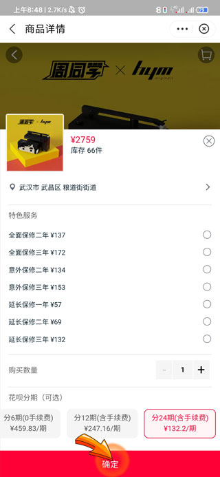 6、最后将花呗分期调为“分24期”,点击页面底部的“确定”选项即可。