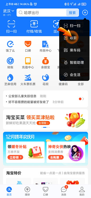 2、此时页面右上角会弹出一个小窗口,点击窗口中的“收款”选项。