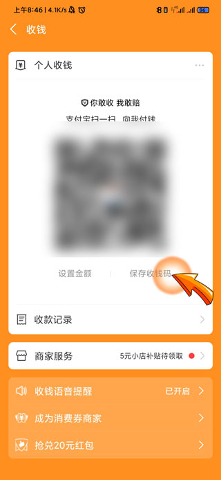 3、进入页面后即为收款码,同时可以点击收款码右下方的“保存收钱码”选项将收款码保存到相册中。