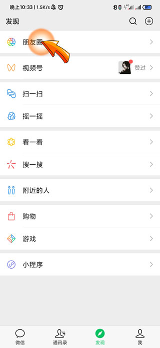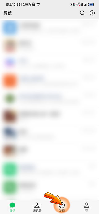 1、朋友圈设置只给一个人看需要打开微信APP,点击页面下方的“发现”选项。