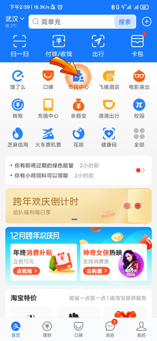 1、支付宝绑定社保卡需要打开支付宝APP,点击“市民中心”图标。