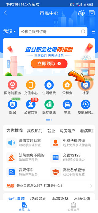 2、然后点击市民中心中的“社保”选项。