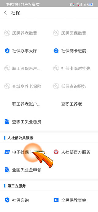 3、再点击人社部公共服务中的“电子社保卡”选项。