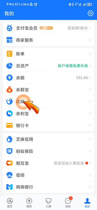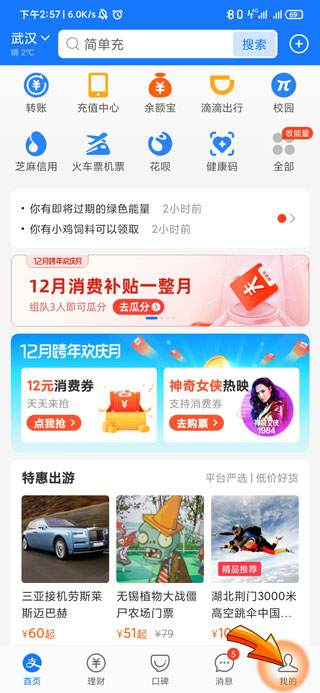 1、淘宝退款到花呗查询首先需要打开支付宝APP,点击页面右下角的“我的”图标。