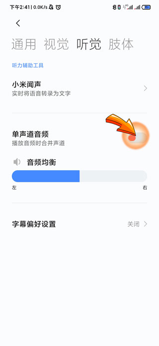 5、最后将听觉页面中的“单声道音频”右侧的开关打开即可增加手机的声音。