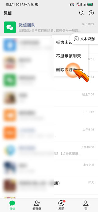 微信团队是无法关闭的,只能将其在聊天界面中删除,首先需要打开微信APP,然后在聊天界面中长按“微信团队”图标,然后点击弹出窗口中的“删除该聊天”选项,最后再点击中部弹窗中的“删除”选项即可。