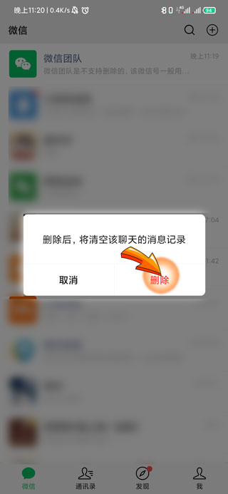 3、最后再次点击弹出窗口中的“删除”选项,即可将微信团队从聊天界面中删除。