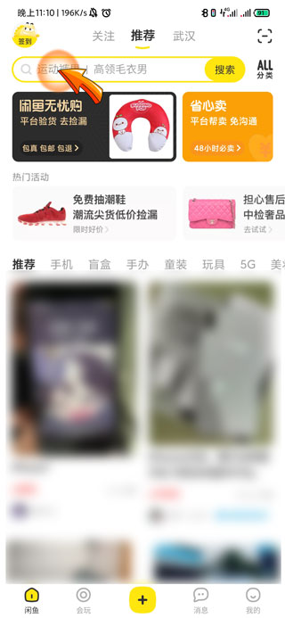 1、闲鱼搜索ID需要打开闲鱼APP,点击首页顶部的“搜索栏”图标。