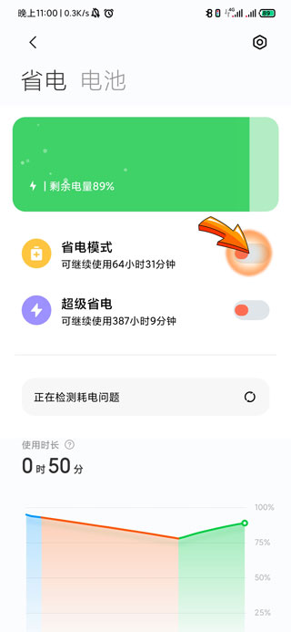 3、最后点击页面中的“省电模式”或者“超级省电”右侧的开关,即可使手机节省电量。