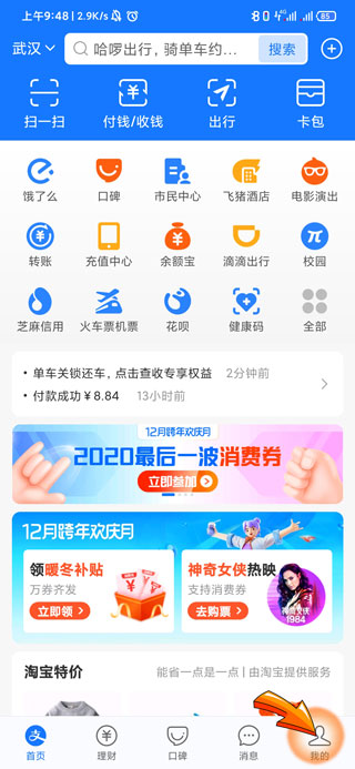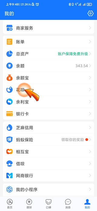 1、取消花呗付款首先需要打开支付宝APP,点击页面右下角的“我的”选项。