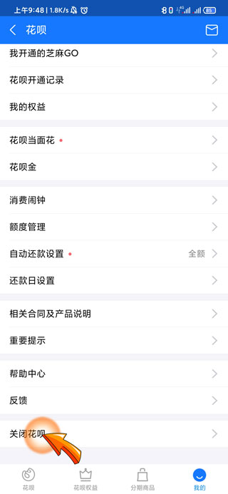 4、再将页面滑到最底部,找到并点击“关闭花呗”选项即可。