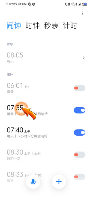 2、进入闹钟页面后点击需要设置音乐的“闹钟时间”。