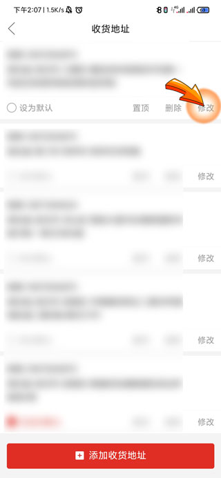 3、进入收货地址页面后找到需要修改的地址,点击其右下角的“修改”选项进行修改即可。