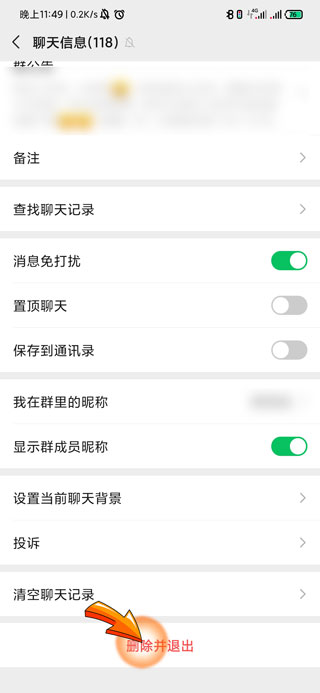 3、进入群聊主页后,滑至页面底部,点击“删除并退出”选项即可退出群聊。
