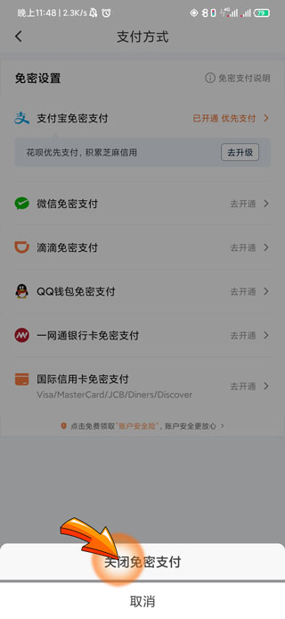 5、最后点击页面下方弹出的“关闭免密支付”选项即可取消免密支付。