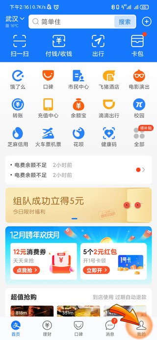 1、支付宝绑定银行卡首先需要打开支付宝APP,点击页面右下角的“我的”选项。