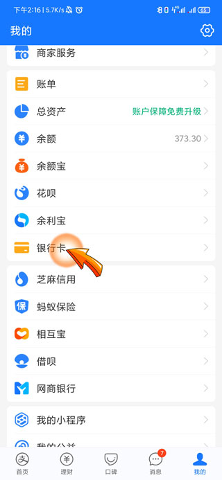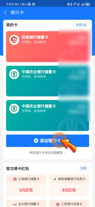 3、进入银行卡页面后点击我的卡下方的“添加银行卡”选项。