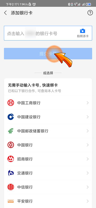 4、最后输入需要添加的银行卡号,点击“提交卡号”选项,完成相关信息填写即可绑定银行卡。