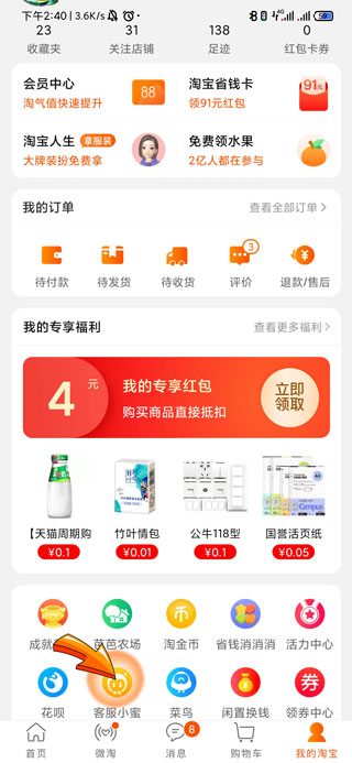 2、然后在我的淘宝页面中找到并点击“客服小蜜”图标。