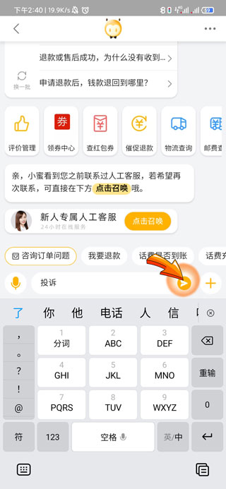 3、之后输入“投诉”文字,点击右侧的“发送”箭头,发送给客服小蜜。