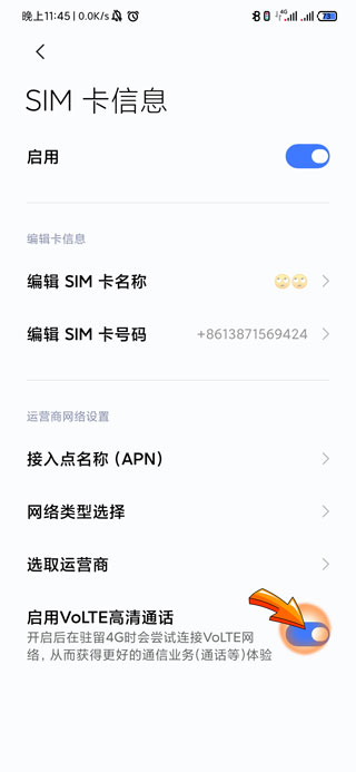 4、最后点击sim卡信息中下方的“启用volte高清语音通话”选项,将其关闭即可。