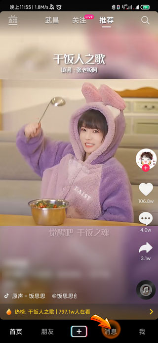 1、抖音查看评论需要打开抖音APP,点击页面右下方的“消息”选项。