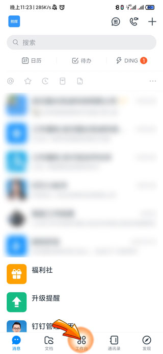 1、钉钉申请请假首先需要将钉钉APP打开,点击页面下方中部的“工作台”图标。
