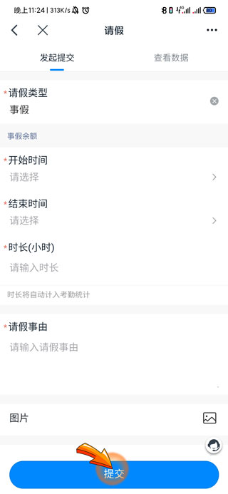 3、填写好相关的请假信息,最后点击下方的“提交”选项即可完成请假申请。