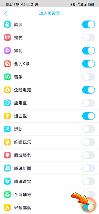 3、然后将页面滑至最底部,点击打开“兴趣部落”右侧的开关。