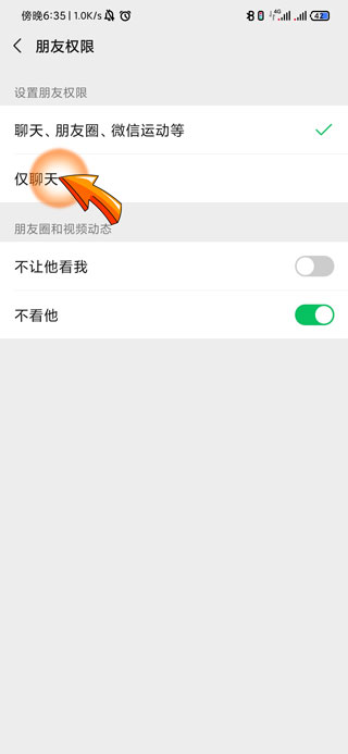 3、在朋友权限中点击“仅聊天”选项,即可屏蔽朋友圈。