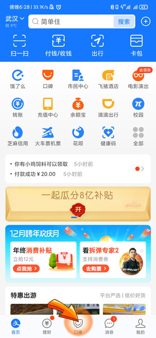 1、支付宝口碑订单查看首先需要打开支付宝APP,点击下方中部“口碑”图标。