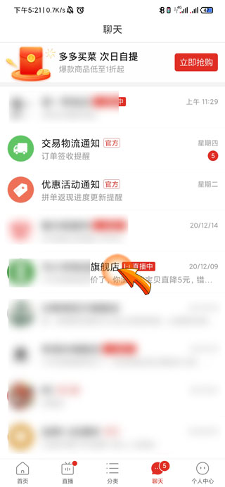 1、拼多多聊天记录删除需要打开拼多多APP,点击右下方的“聊天”选项。