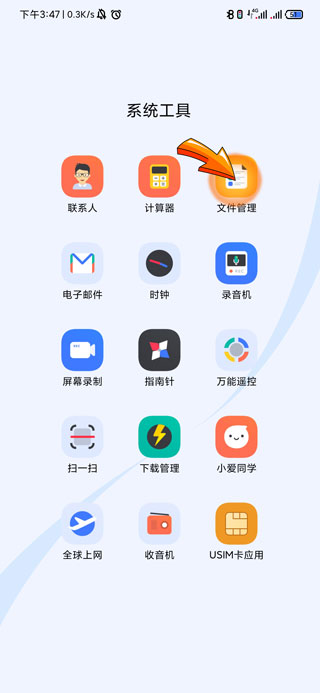 1、手机下载文件查找首先需要点击打开手机“文件管理”界面。