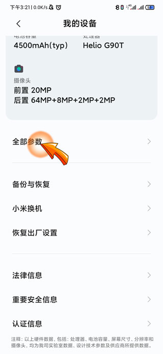 3、在手机型号信息下方有一个“全部参数”,点击进入。