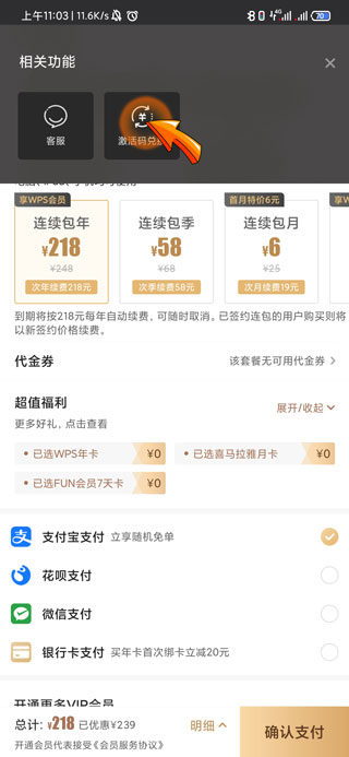 4、在弹出的窗口中点击“激活码兑换”选项。