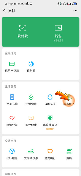 3、在页面中找到“城市服务”图标,点击进入。